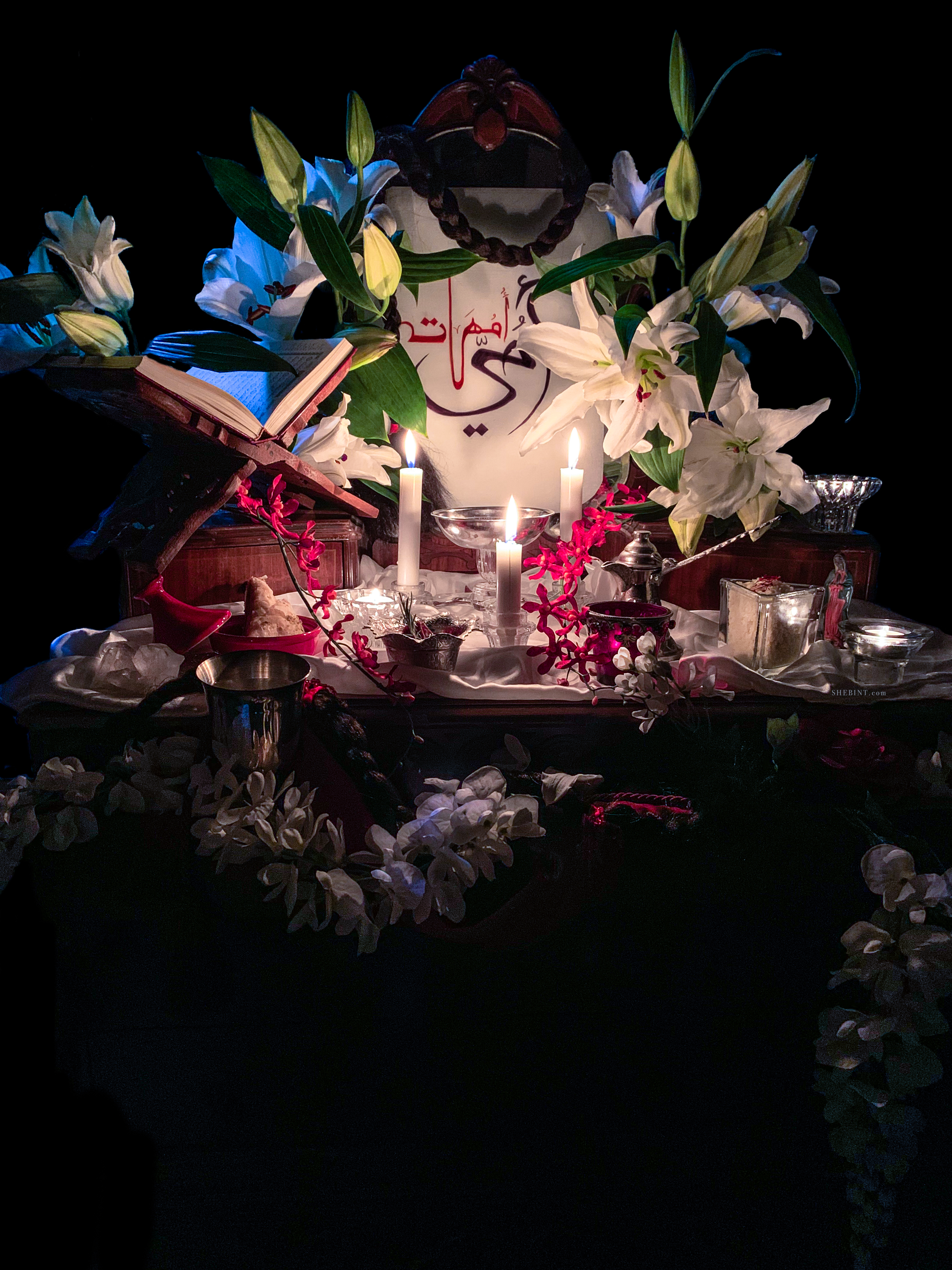 Mixed media altar installation (ink, hair, candles, glass, henna, incense, flowers, food, silver, aluminum, water, quartz crystals, wood, wax, silk)